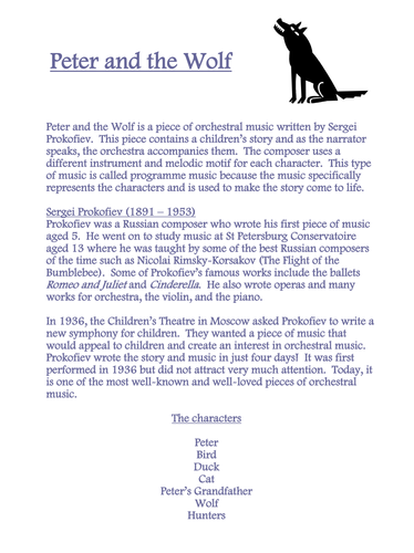 It was originally released theatrically as a segment in make mine music. The music for peter and the wolf was composed by sergei prokofiev. It is a children's story (with both music and text by prokofiev), spoken by a narrator accompanied by the orchestra. Peter and the wolf was an immediate success and has been loved by children all over the world. Romeo and juliet was in the pipeline, he'd moved back to moscow after more than one of my orchestral pieces (peter and the wolf) was an experiment.